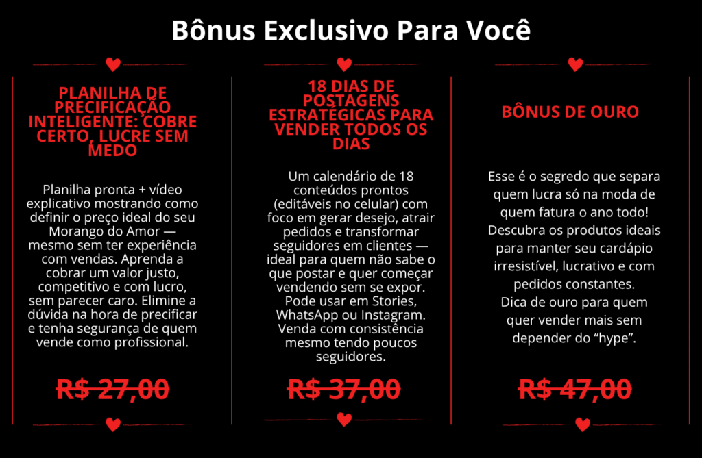A venda do Morango do Amor só pode ser realizada através deste site, registrado em nome de Editora Brava. Qualquer outro site onde você encontre este programa é uma FALSIFICAÇÃO e vai contra as leis. Evite falsificações e recuse conteúdos ilegais ou pirateados. NÃO adquira programas parecidos e que não possuam a qualidade de ensino que vai ajudar na sua jornada para o sucesso no marketing digital com vendas de e-books. Não nos responsabilizamos por compras realizadas em outros sites.